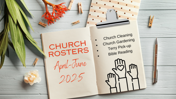 Please add your availability. The clipboards can be found on the table in the foyer. Volunteers are needed for - Bible Reading (weekly) - Church Cleaning (Weekly volunteers needed during June and July, please) - Yard Maintenance (fortnightly) and - Picking up Terry (weekly). |
